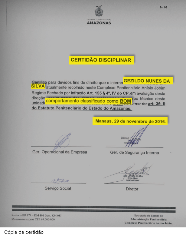 A seu favor, Silva tinha uma certidão expedida pela direção do Compaj declarando que seu comportamento era “bom”. Valois diz que dificilmente Silva seria posto em liberdade por conta das tentativas de fuga, mas que poderia decidir pela ida do preso para o regime semi-aberto.
