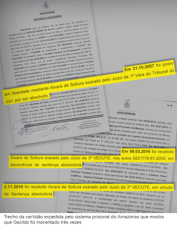 A história de Gezildo Nunes da Silva no sistema penitenciário onde ele acabou morrendo começou em 2002. Documentos da Justiça do Amazonas indicam que ele foi preso por homicídio em abril de 2002. Em agosto de 2004, ele é posto em liberdade provisória, mas em abril de 2007, volta a ser preso, ainda por conta do homicídio do qual era acusado.